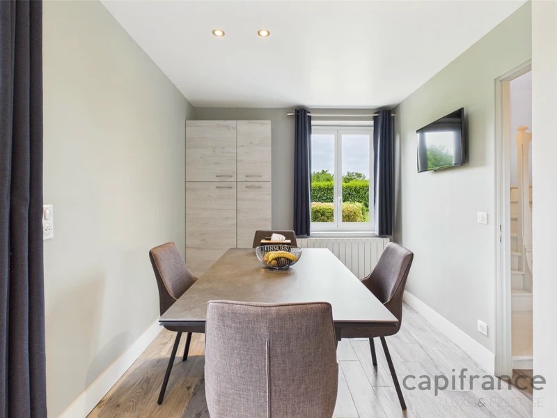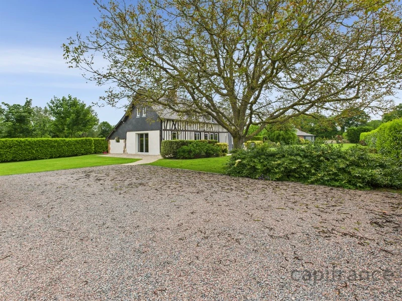 A seulement deux minutes du centre historique de Honfleur, cette superbe maison normande rénovée avec goût conjugue le charme de l'architecture traditionnelle à un confort de vie résolument contemporain. Dans la maison principale, dès l'entrée, vous serez séduit par un vaste espace de vie baigné de lumière, comprenant une cuisine aménagée et équipée ouverte sur une salle à manger conviviale, un salon chaleureux avec son poele ainsi qu'un salon télévision. En rez-de-chaussée également, une grande buanderie ainsi qu'une pièce pouvant faire office de bureau complète l'ensemble. À l'étage, vous trouverez deux belles chambres lumineuses, se partageant une salle de bain moderne et raffinée, ainsi qu'une élégante suite parentale offrant calme et intimité. En complément, une maison d'amis entièrement indépendante comprend une chambre, une cuisine américaine, un salon accueillant et une salle d'eau. Idéal pour recevoir famille, amis ou pour envisager une activité de location saisonnière. Un grand garage et une charreterie aménageable selon vos envies (atelier, salle de sport, espace bien-être…), viennent parfaire ce bien. Le tout est niché au cœur d'un jardin clos, paysagé et arboré avec soin, où règne le calme. L'entretien est facilité par des tondeuses robotisées pour un gazon toujours impeccable. Un bien rare dans un environnement paisible, à deux pas de l'effervescence honfleuraise. Vous n'avez qu'à poser vos valises et profiter de Honfleur, le charme de ses ruelles mais aussi de la tranquillité du jardin. Les honoraires d'agence sont à la charge de l'acquéreur, soit 4,44% TTC du prix hors honoraires. Les informations sur les risques auxquels ce bien est exposé sont disponibles sur le site Géorisques : www. georisques. gouv. fr. Réseau Immobilier CAPIFRANCE - Votre agent commercial (RSAC N°792 890 550 - Greffe de LISIEUX) Catherine LE COUTALLER Entrepreneur Individuel à Responsabilité Limitée 06 45 55 40 38 - Réf.906226