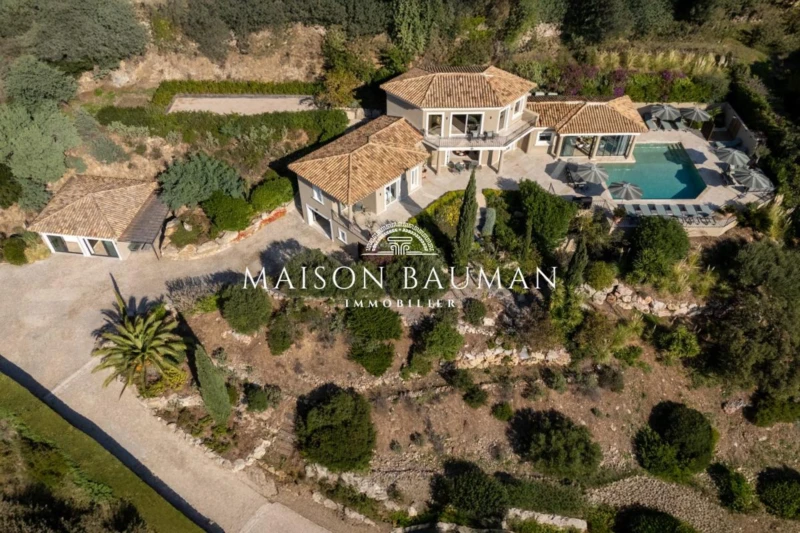 Maison Bauman Immobilier | Golfe de Saint-Tropez vous présente, au coeur du prestigieux quartier de Sainte-Maxime et sur le parcours de golf, cette villa Provençale d'exception, offrant un cadre de vie rare, alliant sérénité, raffinement et proximité des sites emblématiques de Saint-Tropez. Érigée sur un terrain paysager et entièrement clos de 4 170 m², cette somptueuse villa de 300 m² habitables, exposée plein Sud, incarne l'élégance intemporelle, le confort absolu et les volumes généreux, pour une expérience de vie unique sur la Côte d'Azur. Le salon lumineux et spacieux, décoré avec un goût raffiné et équipé de mobilier d'exception, s'ouvre sur une cuisine moderne et hautement équipée, où une grande table à manger invite à des repas conviviaux dans un cadre sophistiqué. De larges portes coulissantes offrent un accès direct à la terrasse ensoleillée et à la piscine chauffée, mariant harmonieusement intérieur et extérieur. Une terrasse côté montagne complète les espaces extérieurs, offrant intimité et sérénité. La villa dispose de six chambres généreuses, toutes dotées de salles de bains privatives luxueusement aménagées avec douche et toilettes. La suite parentale du premier étage se distingue par sa baignoire de prestige, sa double douche à l'italienne et ses doubles vasques, tandis que la deuxième suite parentale, située à l'étage inférieur, offre un confort équivalent. Les autres chambres, y compris celles de la maison d'amis indépendante, assurent intimité et confort à tous les occupants, avec des équipements de très haute qualité. À l'extérieur, le jardin méditerranéen et la terrasse orientée Sud, équipés de chaises longues, parasols et douche extérieure, créent un véritable havre de détente et de raffinement. Un grand abri pour voiture avec deux bornes de recharge électrique et un vaste parking viennent compléter cette propriété d'exception, tandis qu'un terrain de boules privé ajoute une touche authentique à la vie provençale. À seulement quelques minutes de la plage de La Nartelle et du centre animé de Sainte-Maxime, cette villa offre un équilibre parfait entre intimité, détente et divertissement, dans un cadre sécurisé et prestigieux. Une résidence rare, conjuguant élégance, confort et art de vivre méditerranéen, à découvrir absolument. Honoraires à la charge du vendeur. Classe énergie B, Classe climat A Montant moyen estimé des dépenses annuelles d'énergie pour un usage standard, établi à partir des prix de l'énergie de l'année 2021 : entre 1900.00 et 2630.00 €. Les informations sur les risques auxquels ce bien est exposé sont disponibles sur le site Géorisques : georisques.gouv.fr. Bien présenté par Agences de France par délégation. Agences de France – SIREN : 899413603 – Titulaire de la carte T : 29012021000000009 non habilité à percevoir des fonds
