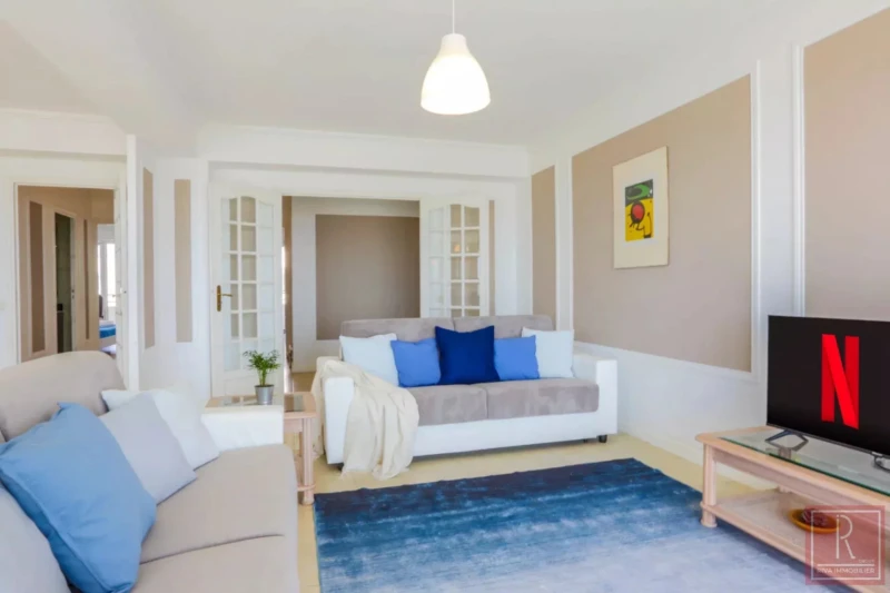 DERNIERE ETAGE PROMENADES Adresse d’exception sur la Promenade des Anglais ! Au sein d’une résidence de standing, superbe 3 pièces de 80 m² situé à l’avant-dernier étage, offrant une vue mer panoramique. Cet appartement traversant se compose d’une élégante entrée, d’un vaste séjour baigné de lumière face à la mer, d’une cuisine séparée et entièrement équipée avec balcon, d’une chambre avec armoire miroir et balcon, d’une salle d’eau moderne et de WC indépendants. Une cave vient compléter ce bien rare. Loyer : 1500euros Dépôt garantie : 2000euros Commission agence locataire : 800euros + 120euros (état des lieux) : 920euros