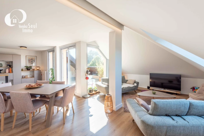 À vendre entre particuliers, sur la commune de Douvaine, à seulement quelques pas du centre et de toutes les commodités, un appartement de Type 4 traversant offrant une surface habitable de 103 m2 (dont 87 m2 Carrez) dans une copropriété de 1990. Entièrement rénové en 2023 avec des matériaux haut de gamme, cet appartement combine confort, modernité, élégance et fonctionnalité. Il séduit par sa rénovation soignée et son emplacement privilégié à proximité immédiate du centre de Douvaine. Une partie de l'appartement est située sous les combles, ce qui apporte un charme supplémentaire et l'avantage de n'avoir aucun voisin au-dessus. L'isolation a été entièrement refaite, garantissant une bonne performance thermique. Toutes les fenêtres ont été remplacées en 2023 par des menuiseries en aluminium avec double vitrage et sont équipées de volets roulants électriques. L'appartement se compose comme suit : L'entrée donne sur une cuisine contemporaine, conçue sur mesure, qui est parfaitement équipée et pensée dans les moindres détails, semi-ouverte sur une vaste pièce de vie d'environ 40 m2, baignée de lumière grâce à de larges baies vitrées et à un grand velux électrique. Cet espace donne directement accès à la terrasse tropézienne exposée Sud-Ouest. Un WC indépendant avec lave-mains complète cet espace vie. L'espace nuit se compose d'un dégagement qui dessert trois chambres : l'une avec placard intégré sur mesure, une autre aménagée en dressing sur mesure avec accès direct au balcon, ainsi qu'une salle de douche. L'appartement dispose de deux garages privatifs ainsi que d'une cave, et la copropriété offre également un parking collectif extérieur pour les résidents. Côté pratique, toutes les commodités sont accessibles en seulement 2 minutes à pied : boulangerie, presse, boucherie, médecins, pharmacie... Les écoles, de la maternelle au collège, se trouvent également à proximité. Les transports en commun sont rapidement accessibles, un atout idéal pour les travailleurs frontaliers. L'accès aux autoroutes vers Annecy, Lyon ou Paris se fait en seulement 20 minutes. Pour vos loisirs, le lac est accessible en seulement 5 minutes en voiture ou 15 minutes à vélo. Les informations sur les risques auxquels ce bien est exposé sont disponibles sur le le site Georisque www.georisques.gouv.fr Pour les informations, merci de contacter directement mon Coach en immobilier en cliquant sur le bouton < < voir numéro>>. Vendez Seul Immo accompagne les propriétaires dans leur vente immobilière. Grâce a un concept innovant, prix fixe et tout compris de 2 990 Eur - sans mandat, sans commission et sans exclusivité. Tous les détails sur le site site Vendez Seul Immo. - Annonce rédigée par un Conseiller en coaching immobilier indépendant membre du réseau Vendez Seul Immo - - Annonce rédigée et publiée par un Agent Mandataire -