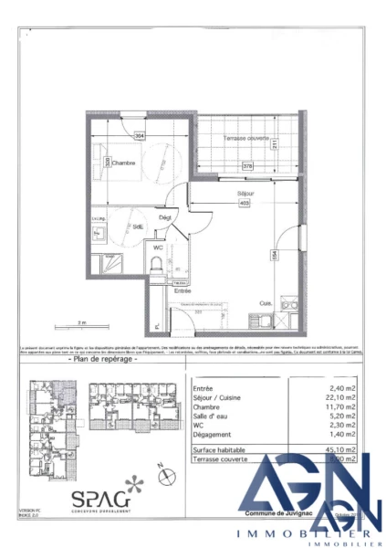 JUVIGNAC : APPARTEMENT 2 PIÈCES de 45,1M2 - avec locataire Il est situé 3ème étage d'un immeuble récent et il est composé d'un séjour / cuisine aménagée de 22m2 donnant sur une terrasse de 8m2. La partie nuit desservie par un dégagement est composée d'une chambre de plus de 11m2, d'une salle d'eau et de WC séparés. L'entrée possède un grand placard. Il y a en sous-sol une place de parking réservée à l'appartement. Juvignac (34990, agglomération de Montpellier), une ville idéalement placée aux portes de Montpellier ! L'appartement est proche de toutes les commodités, des transports en commun et avec un accès facile au axes routiers. Il y a également plusieurs écoles (maternelles, élémentaires et collège) proches de l'appartement. Cet appartement de 2 pièces est proposé à l'achat pour 151 000 EUR. Les charges de la copropriété s'élèvent à 167EUR mensuelles. Pour information niveau financier, l'appartement est actuellement loué pour 582EUR + 135EUR de charges récupérables jusqu'en janvier 2028. Retrouvez les informations ERP de la commune de ce bien sur : https://www.france-erp.com/etat-des-risques-et-pollutions-par-ville; Prenez contact avec votre agence AGN Immobilier MONTPELLIER au 04 67 21 16 45 ou [email protected] N'hésitez pas à aller voir nos autres biens sur notre site internet : https://www.agn-immobilier.net/