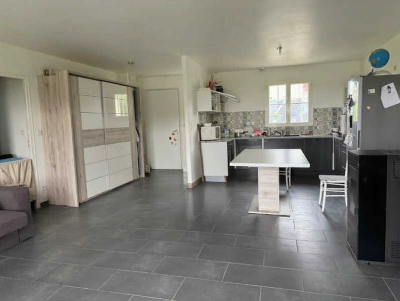 CHATEAU THIERRY pavillon de plain pied de 82 m² habitables comprenant une entrée, une pièce de vie avec cuisine ouverte sur séjour de 38 m² environ, un couloir qui dessert 3 chambres et une salle de bains. Un garage avec grenierUn terrain de 777 m² clos. Belle vue sur la campagne. (4.74 % honoraires TTC à la charge de l'acquéreur.)