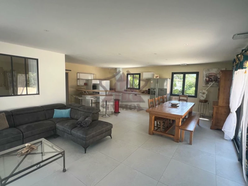 A vendre - Saint-Ambroix Maison neuve de plain pied avec piscine dans un environnement privilégié avec une belle vue, sans nuisances, proche des commerces. Terrain plat et entièrement clôturé et sécurisé, arboré avec gout, bien entretenue avec parking en gravier, terrain de pétanque, 2 portails électrique. La partie maison est composée d'une grande pièce à vivre de 51m2 ouverte sur la cuisine ; de 4 chambres avec placard intégrés dont 2 chambres parentales avec salle d'eau et wc ; une salle de bains comprenant douche et baignoire balnéo ; une terrasse couverte donnant sur la piscine. On trouve également un gite indépendant en face de la piscine avec salon - cuisine ouvert , une grande chambre de 20m2 avec salle d'eau et dressing. Chauffage gainable, menuiserie en double vitrage pvc et alu, aucun travaux à prévoir, idéal pour maison d'habitation et/ou gite. A visiter sans tarder. Plus de renseignements sur notre site internet saint-ambroix.letuc.com réf : 92531 Les informations sur les risques auxquels ce bien est exposé sont disponibles sur le site Géorisques : www. georisques. gouv. fr