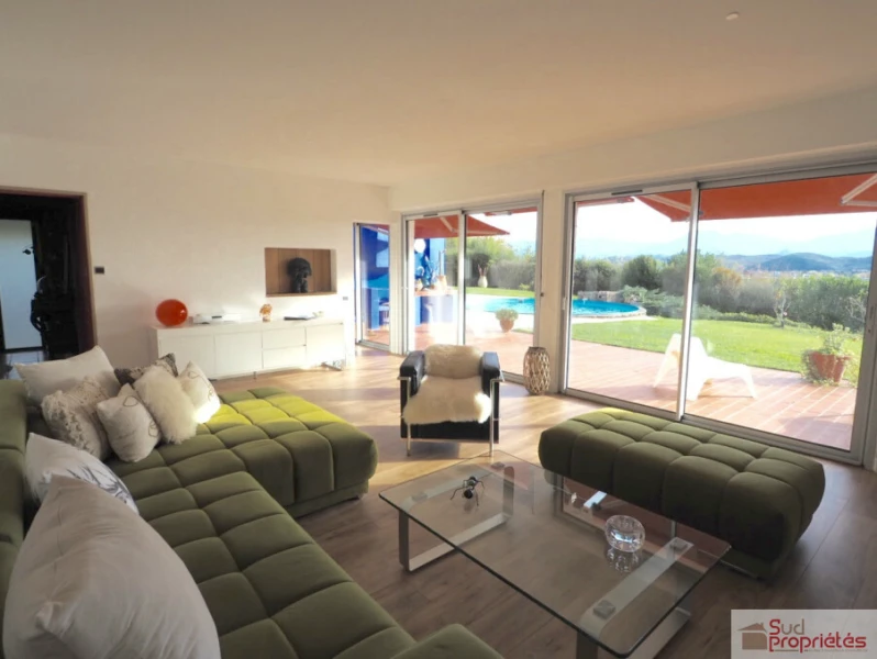 A 5mn du centre ville et de toutes les commodités, sur les hauteurs, au bout d'une impasse, dans un écrin de verdure, cette villa d'architecte de 1971 vous ravira par son allure contemporaine, son confort moderne, sa grande luminosité, sa piscine ronde et sa vue panoramique sur les Pyrénées des plus époustouflantes. Maison de plain-pied de 140 m2 habitables sur sous-sol comprenant un double-garage, un atelier, un bureau et une buanderie. Terrain borné de plus de 9 300 m2 comprenant une partie jardin paysagé avec sa piscine côté Sud et l'accès au sous-sol côté Nord, et une partie champ de 8 000 m2 environ avec bergerie pouvant accueillir un cheval ou autres animaux. Maison: entrée, cuisine aménagée et équipée ouverte sur la terrasse Sud, grand séjour et salle-à-manger de 42 m2 avec grandes ouvertures sur la terrasse Sud, 2 espaces nuit comprenant chacun 2 chambres et 1 salle de bains/eau et wc séparés. La maison a été parfaitement entretenue et rénovée dans les 3 dernières années: PAC air/eau, toiture (étanchéité et isolation), menuiseries, cuisine et pièces de vie neuves ainsi que la porte d'entrée, isolation extérieure des murs Nord et Ouest, parquet, peintures et tapisseries. Une ambiance méditerranéenne où les montagnes remplaceraient la mer. PRODUIT RARE ! Pour plus de renseignements, contactez Nadia au 06 52 15 86 84. Dossier sur demande moyennant la signature au préalable d'un bon de visite faisant office d'accord de confidentialité. Selon l'article L.561.5 du Code Monétaire et Financier, pour l'organisation de la visite, la présentation d'une pièce d'identité vous sera demandée. Prix affiché frais d'agence inclus de 4% à la charge de l'acquéreur.