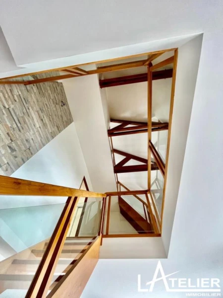 SAINT-GERMAIN-EN-LAYE – À 50 m du Lycée Notre-Dame Idéalement située à deux pas de l'Institut Notre-Dame, cette belle maison familiale développe 210 m² habitables avec un potentiel d'environ 240 m², et est édifiée sur une parcelle arborée de 710 m², à l'abri des regards. Surélevée de deux niveaux en 2003, la maison séduit par ses volumes généreux, sa fonctionnalité, son excellente isolation et sa belle luminosité. Quelques travaux de rafraîchissement intérieur (peintures et pièces d'eau) permettront de la remettre au goût du jour et de se l'approprier pleinement. La maison est organisée sur quatre niveaux : Au rez-de-jardin, vous découvrirez une pièce polyvalente avec rangements, une chambre, une buanderie, une cuisine, une salle de douche, ainsi qu'un accès à la cave et au garage / atelier / vide sanitaire. Au rez-de-chaussée, une magnifique pièce de vie traversante, bénéficiant d'une triple exposition, s'articule autour d'un escalier en toit cathédrale. Cet espace chaleureux comprend une cuisine ouverte sur la salle à manger et un salon offrant la possibilité d'installer une cheminée ou un poêle. De nombreuses ouvertures donnent accès à une grande terrasse avec pergola, idéale pour les repas d'été, et au jardin arboré. Ce niveau dispose également d'une salle d'eau avec WC invités et d'une chambre attenante au séjour. Au deuxième étage, desservi par un élégant escalier en chêne massif clair et verre, avec une superbe charpente apparente, se trouvent trois chambres, une salle de bains avec douche, ainsi qu'un vaste espace bureau ou rangements. Le dernier étage, aménagé sous les toits, offre une première pièce pouvant faire office de bureau ou espace détente, ainsi qu'une grande chambre avec sa salle de douche. L'ensemble s'ouvre sur un beau jardin arboré, comprenant un atelier de jardin et un espace potager, idéal pour une vie familiale. La localisation est particulièrement recherchée : à 50 m de l'Institut Notre-Dame, au-dessus de l'église Saint-Léger et des commerces de proximité. Côté transports, le bus R1 se trouve à 50 m, le tramway T13 à environ 800 m (connexion directe au RER de Saint-Germain), et le RER A ainsi que le centre-ville sont accessibles en 15 minutes à pied. Une maison familiale aux volumes rares, dans un emplacement très agréable, offrant un beau potentiel de valorisation.