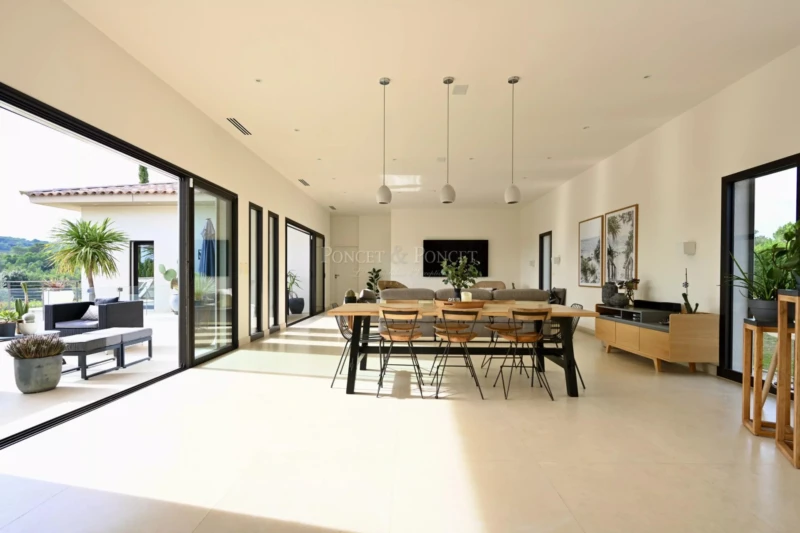 Villa contemporaine de plain pied avec avec vue panoramique sur les vignes et les collines environnantes Située sur 1 hectare dont 7 000 m² de vignes en Côte-du-Rhône (AOC), cette villa moderne bénéficie d’un environnement calme et privilégié. Elle offre une magnifique vue dégagée sur les plaines, les vignes et les collines environnantes, avec une exposition Sud/Ouest et des terrasses qui optimisent la luminosité naturelle. Idéalement positionnée, la villa se trouve à 1h20 de l’aéroport, à 35 minutes de la gare TGV, à proximité des commerces et des services, et à seulement 20 minutes de l’autoroute, facilitant tous vos déplacements. Description : Édifiée en 2014 et entièrement de plain-pied, cette villa de 470 m² au total (252 m² habitables) se distingue par une hauteur sous plafond de 3 m, des matériaux de qualité et un confort moderne. La villa 7/8 pièce dispose 4 chambres, dont une somptueuse suite de 47 m² et un appartement studio indépendant. Une magnifique cuisine moderne spacieuse de 41 m² entièrement équipée et son arrière-cuisine, ouverte sur un salon/séjour de plus de 68 m² au sol en pierre de Tavel, illuminé par 10 mètres de baies vitrées donnant directement sur une terrasse de 48 m². Vous profiterez de plusieurs terrasses totalisant 140 m², d’une piscine chauffée au chlore avec pergola, d’un jacuzzi 3 places, d’un terrain de pétanque, ainsi que de nombreux stationnements et abris pour véhicules. Un grand garage de 136 m² très bien isolé, un cabanon/atelier de jardin en pierre datant de 1905 et un puit en pierre complètent l’ensemble. Le confort et la sécurité sont assurés grâce à un portail électrique avec visiophone, une vidéosurveillance, des volets roulants électriques en grande partie centralisés, du double vitrage aluminium, un forage pour l’eau et un vide sanitaire total. Options et mobilier : La villa est vendue meublée, avec possibilité d’acquérir le matériel viticole pour 100 000 euros en sus du prix. Ce que nous en pensons : Cette villa moderne allie élégance contemporaine et charme du terroir viticole. Son plan de plain-pied, ses espaces lumineux et ouverts sur l’extérieur, la suite parentale avec jacuzzi et la vue exceptionnelle sur les plaines, les vignes et les collines en font un lieu de vie unique. L’intégration de dépendances historiques, de nombreux équipements pratiques, d’un vide sanitaire total, ainsi que la possibilité d’acquérir le matériel viticole, fait de cette propriété un bien rare et complet, idéal pour une vie familiale ou un projet viticole de qualité.